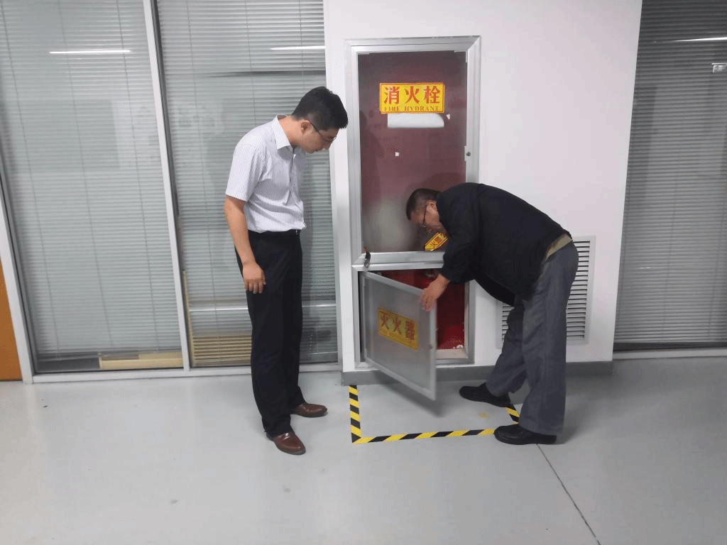 (保卫处防火科副科长陈庆丰对研究院消防设施进行检查)
