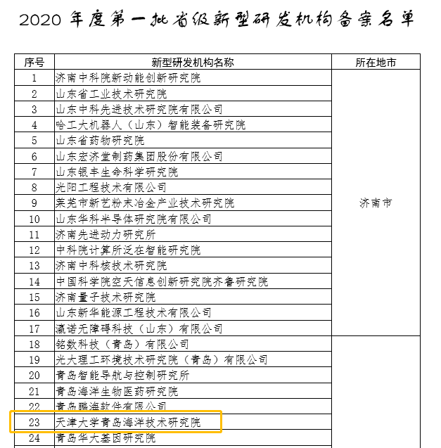 11月18日,山东省科技厅发布《关于公布2020年度第一批省级新型研发机构备案名单的通知》,天津大学青岛海洋技术研究院成功入选。