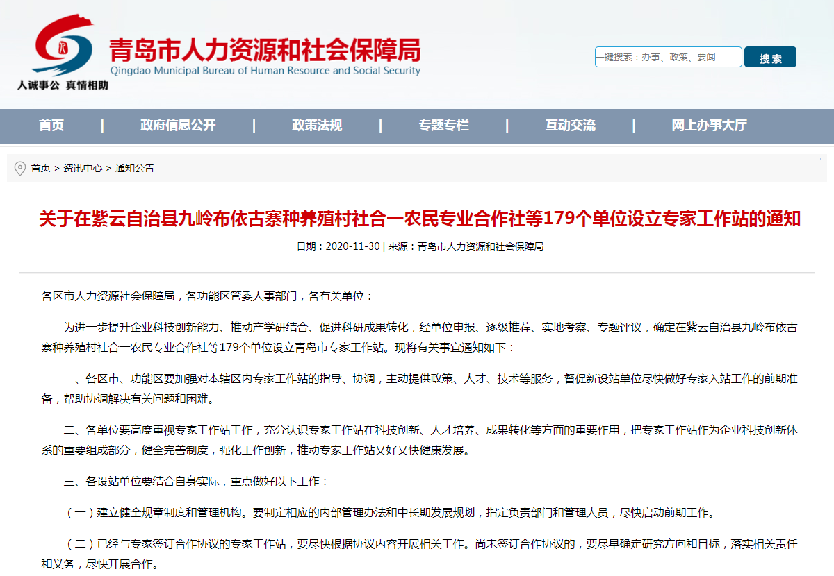 (青岛市人社局发布成立专业工作站的通知)