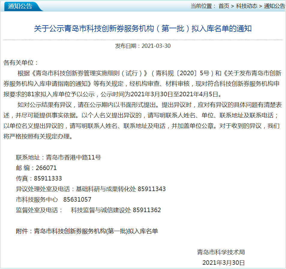 近日,青岛市科技局公布了青岛市科技创新券服务机构(第一批)拟入库名单,天津大学青岛海洋技术研究院、天津大学(青岛)海洋工程研究院有限公司双双入选名单。