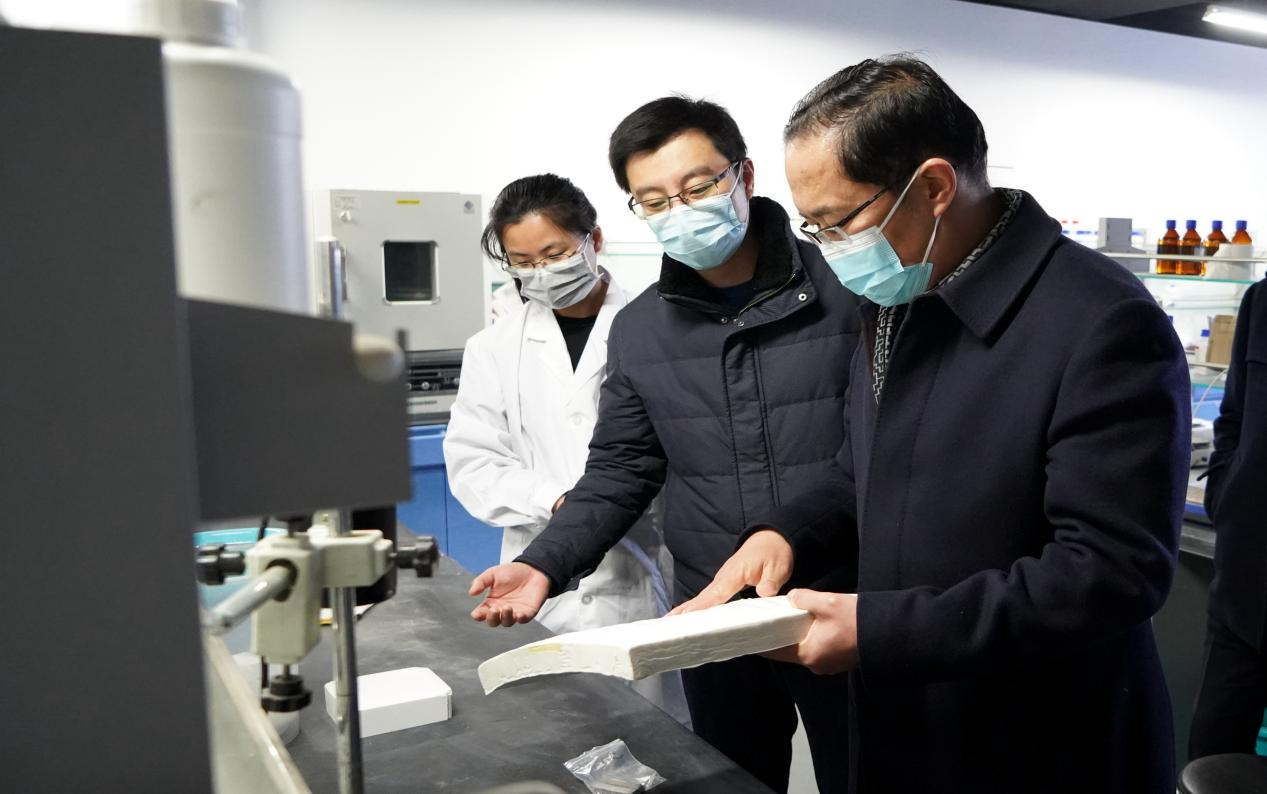 在材料研究所,毛军响与科研人员进行沟通,关注防火隔热类新材料研发平台的一种新型全无机的建筑外墙保温材料研发工作,毛军响详细了解了该新材料在生产成本节约方面的优势,并希望新材料科研创新取得突破并进行产业化落地。