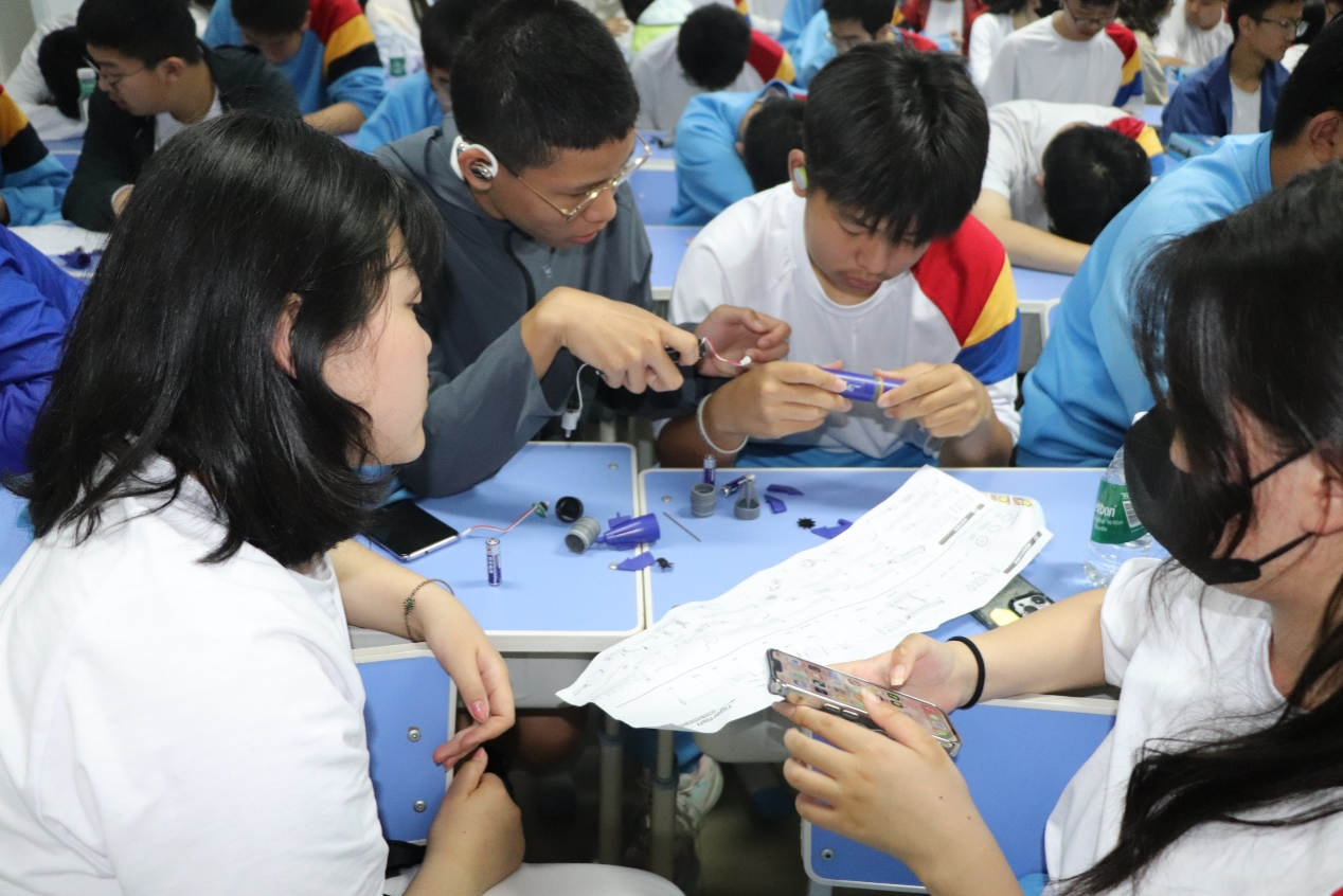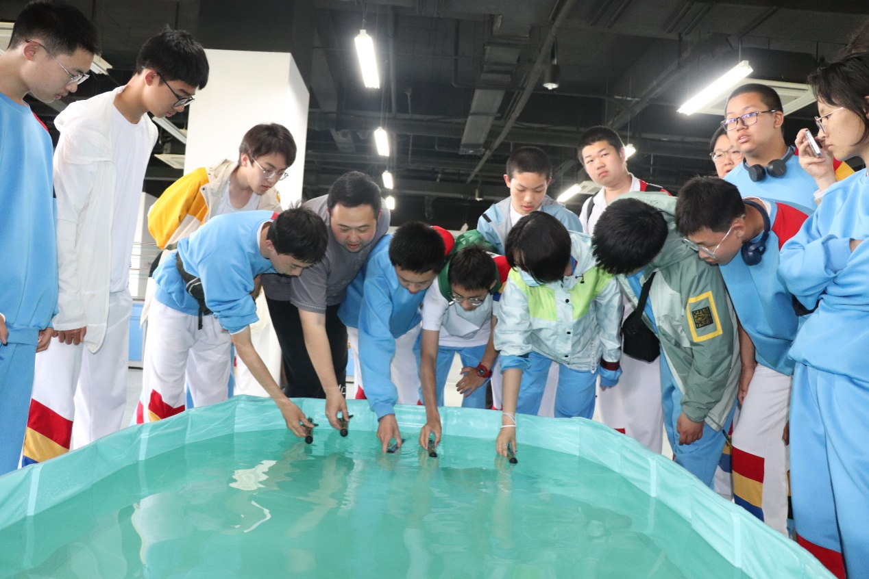 在学习完课程后同学们以小组为单位,合作组装水下滑翔机的简化模型,并在老师指导下进行下水试验和比赛。