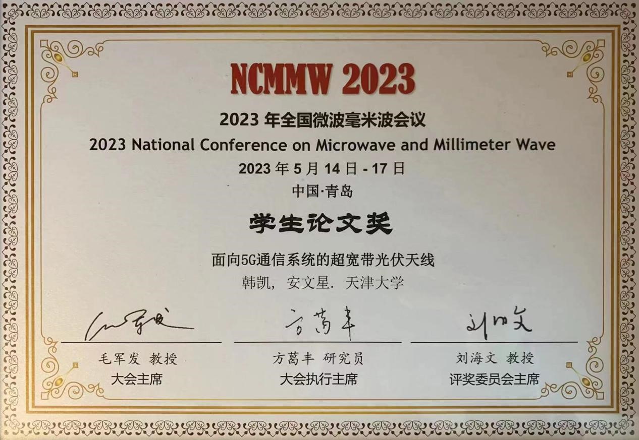 天津大学青岛院学生韩凯获得2023年全国微波毫米波会议学生论文奖