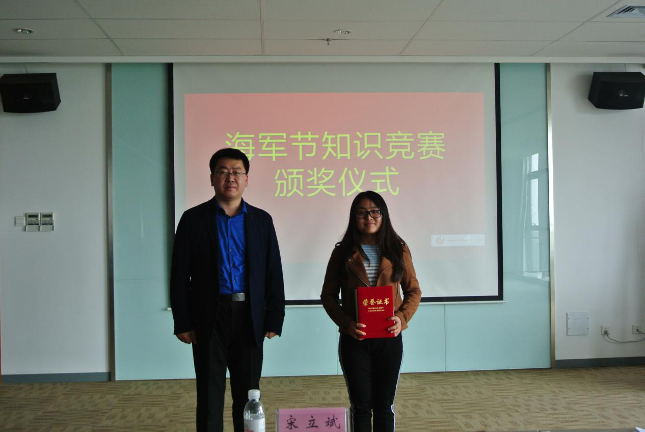 次日,在纪念五四运动100周年大会上,天津大学青岛海洋技术研究院副院长宋立斌为获奖同学颁发证书及奖品。